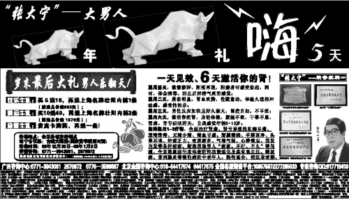 特别是报纸广告,不仅是采用大版面形式,在编排上更讲究技巧,标题采用新闻式、纪实式等,《教你登上性福快车》、《让中国男人更健康、更自信》等,排版格式和报纸保持一致,更有新闻感,更能紧紧抓住消费者的眼球。