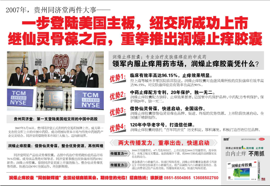 贵州同济堂成为中国本土一家中药企业,成功登陆美国纽约证券交易所,这一刻,同济堂成为中国中药走向焦点。与此同时,上市后首次推出的新品――,也交由孔明策划紧锣密鼓的策划中,希望能成为继仙灵骨葆之后,集团又一支柱型产品。