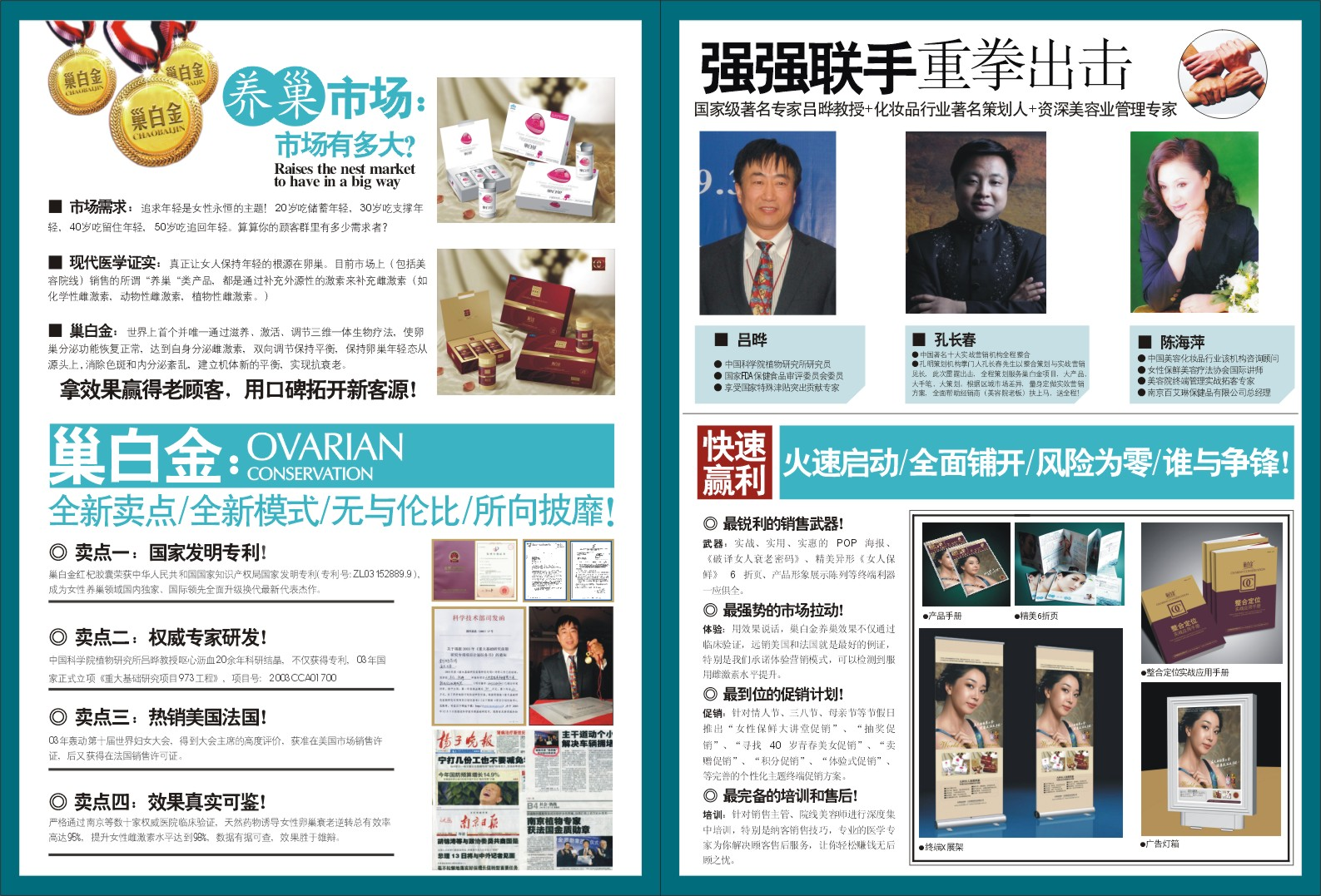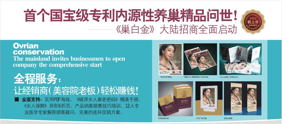 从10年开始到今天,拥有女性专业卵巢保养产品――巢白金。靠深挖“通过滋养、激活、调节三位一体生物疗法,一下点开了“女人早衰”的死穴,立刻刮起深圳、上海、浙江等地女性“护巢养颜”的旋风,并且开辟独特的终端(美容院)及营销战略,使得该产品成为一度成为女性卵巢保养的品牌。做为该产品的营销策划机构――孔明营销策划和首席策划导师孔长春老师,把这个明星产品的诞生做一个记录,以记之。