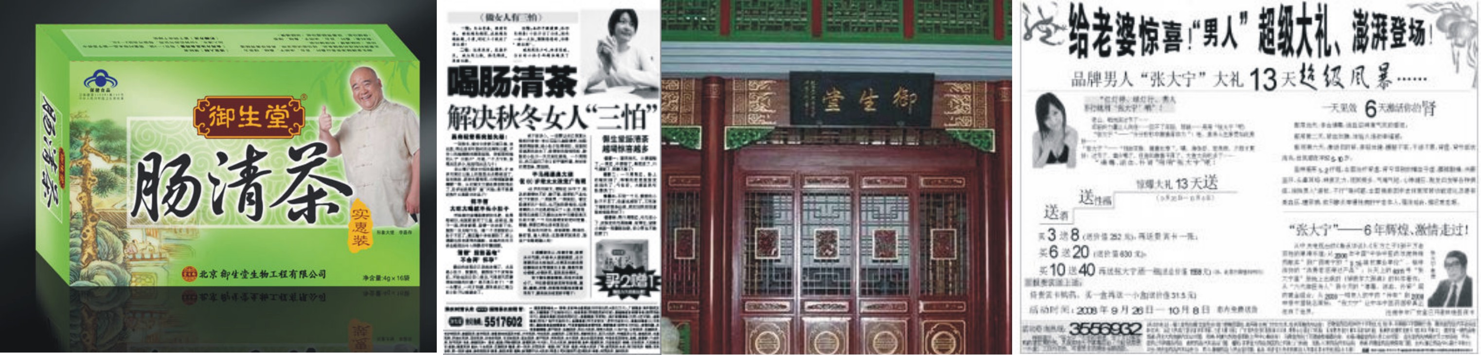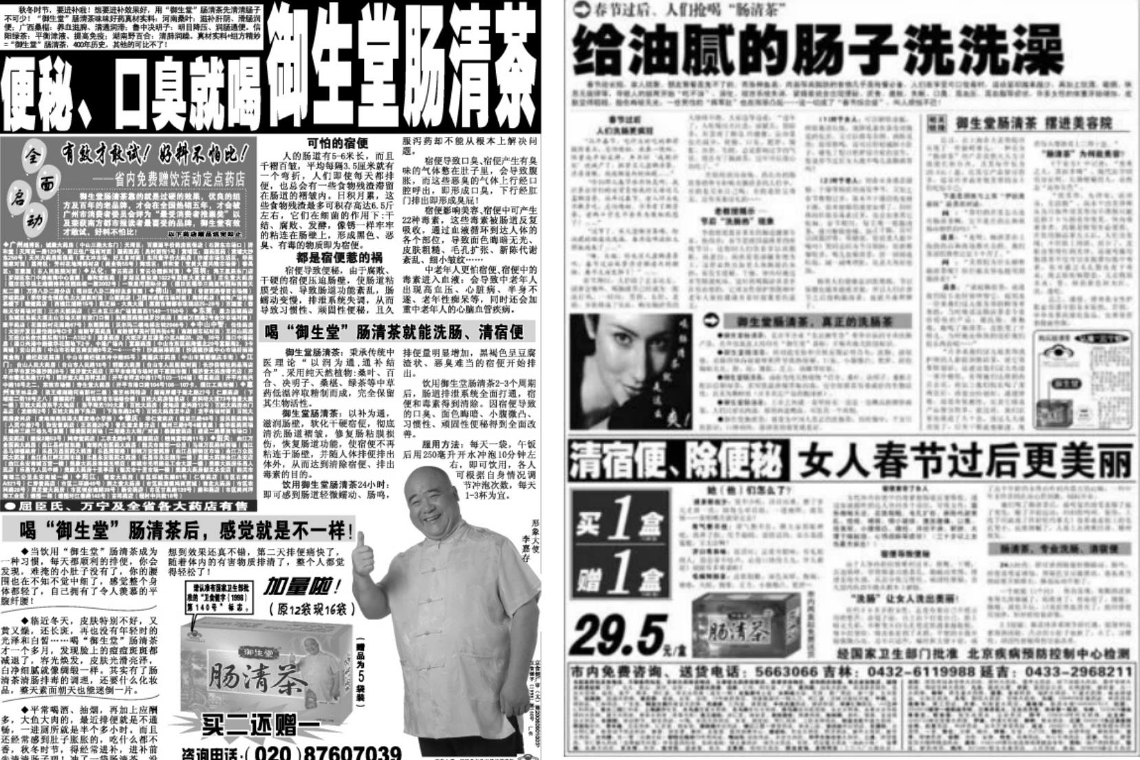 从2003年8月8日《成都晚报》通栏广告,标题是《肠清茶,专业洗肠清宿便》以及后来的《宿便的女人老的快》、《喝肠清茶,才能洗肠清宿便》《给肠子洗澡,爱美女士也疯狂》等软文,都明确的把肠清茶的产品功效进行了明确阐述,其概念承接以前排毒养颜胶囊的“排毒养颜”概念,顺延芦荟排毒胶囊“排毒肠动力,美颜新主张”的营销思维,从而使洗肠概念深入人心,而“清宿便”则是肠清茶有效区分竞争对手的排他性概念。