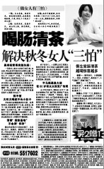 用铺天盖地来形容肠清茶的广告并不为过。在全国各地的主要报纸媒体,其广告投放基本以整版和半版的形式出现。《扬子晚报》、《新闻晨报》、《北京晚报》、《广州日报》《春城晚报》等媒体每周都能看到肠清茶的广告。这种强势广告不仅促进肠清茶的知名度和销量快速提升,也能有效打击竞争对手、抬高进入门槛。