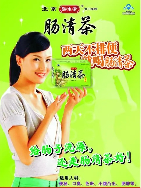 肠清茶早期将目标人群锁定为具有购买力和美容需求的中青年女性。广告将造成便秘的罪魁祸首归结于“宿便”,并将其带来的尴尬与危害绘声绘色的描写:如口臭、黄褐斑、皱纹、面色晦暗、痤疮、皮肤粗糙、小腹微凸、肥胖等,在具有感召力的描述下,有着普遍的“皮肤好、身材好、气质好”梦想的女性能不动心?