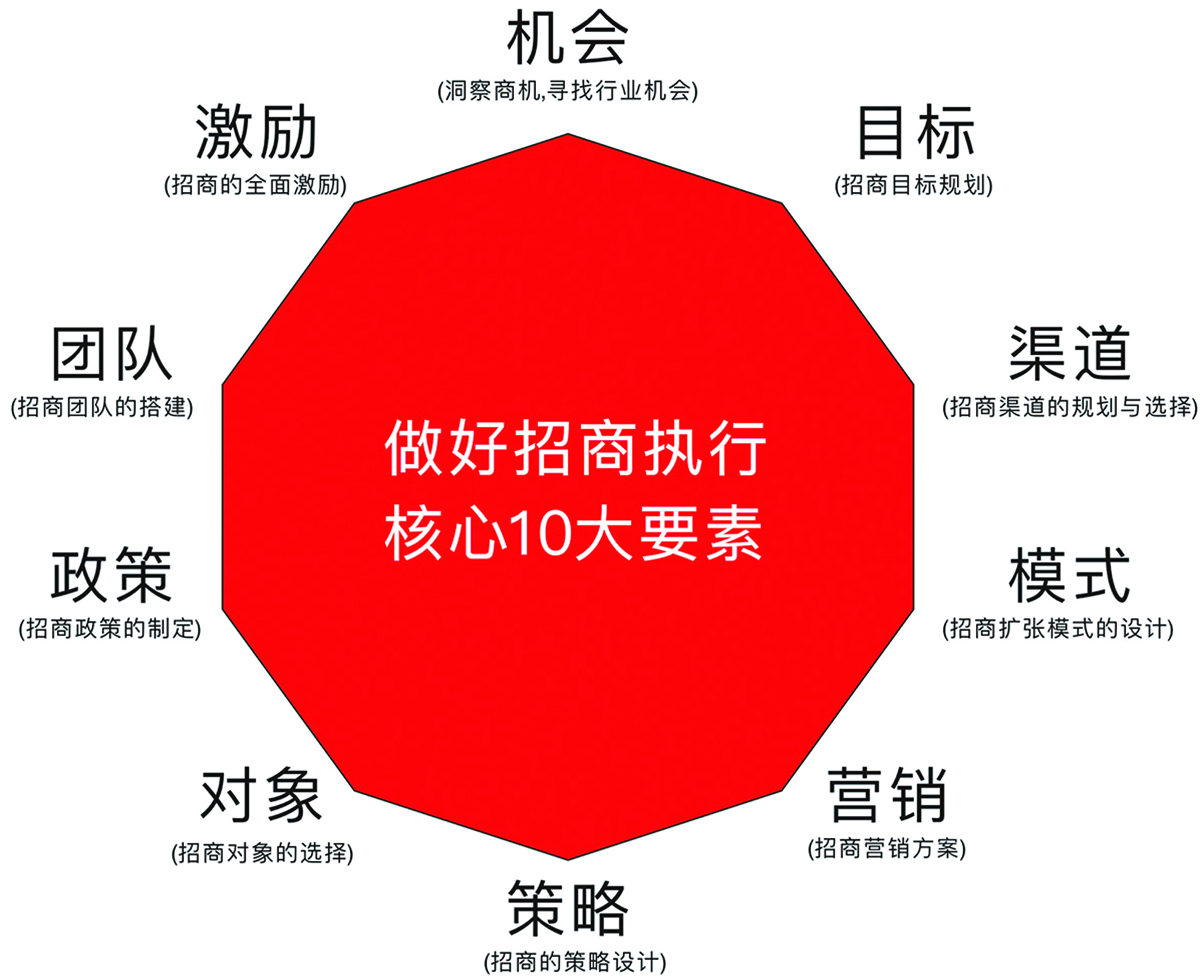 招商执行对于现代企业来说,是锁喉的一环。企业战略目标的实现、品牌的建设、产品的销售、利润的实现,都取决于招商执行这第一步迈得成功不成功。但是很多企业刚启动招商甚至已经启动招商后,都不知道如何下手,没有思路。因此,企业要把招商落地做扎实,就必须从招商目标的规划、招商模式的确立、招商政策的设计、招商渠道的选择、代理商的筛选标准、招商营销的打法、招商工具的设计、招商团队的搭建、招商团队的培训、招商团队的激励等方面进行系统化构思和设计,才能把招商执行落到实处。