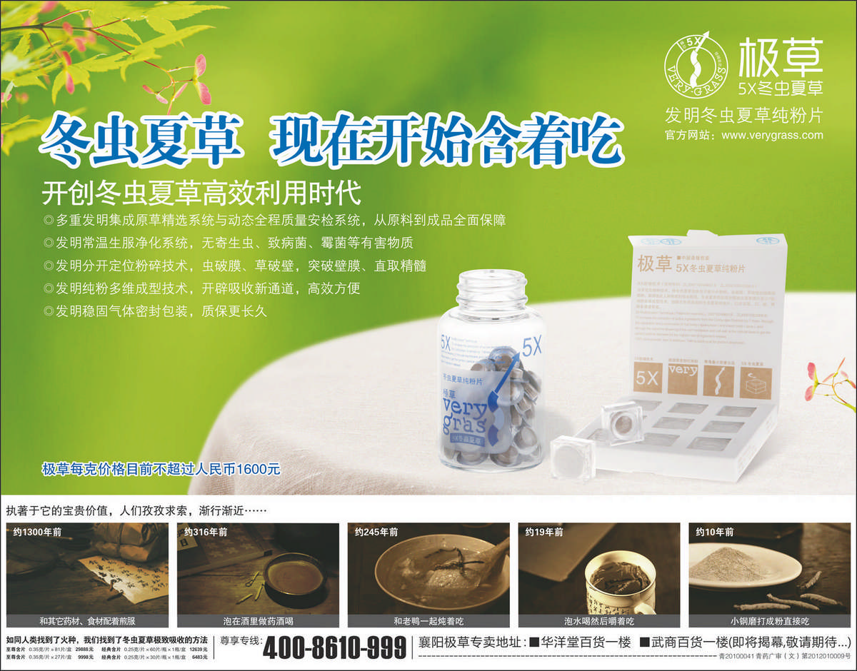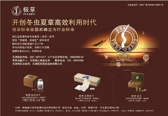 极草建立品牌初期使用的系列央视栏目。在2013年时期,极草对央视栏目的使用则更加炉火纯青:2013年1月31日,CCTV-1黄金时段(新闻联播后,焦点访谈前)19:36分,开年“震撼首播”《冬虫夏草公益宣传片》,据说是央视第一次在A特黄金时段播出3分钟的“公益广告”。2013年315晚会前,“冬虫夏草公益宣传片”继续播了3分钟之久。